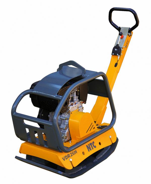 Виброплита реверсивная NTC VDR 26H предназначена для проведения грунтовых и асфальтовых работ различного типа, а также при строительстве, ремонте и реконструкции автомагистралей, проселочных и лесных дорог, железнодорожных путей, копании и засыпке канав и траншей для трубопроводов, закладке фундаментов, а также при ландшафтном строительстве. Данная модель специально предназначена для уплотнения рыхлых грунтов типа песка и гравия. Уплотнение обратных засыпок характеризуется значительными нагрузками и износом уплотняющей техники. Для привода от двигателя к вибратору используется клиноременная передача. Система управления реверсом движения машины - гидравлическая. Вибратор виброплиты представляет собой двухвальный вибровозбудитель с дебалансами на каждый из валов‚ причем вращаются они синхронно и в противоположных направлениях. Конструкция машины позволяет использовать рукоять с подъемом для поворота виброплиты. Путем манипулирования установкой угла наклона результирующей двух центробежных сил этих дебалансов можно получить только вертикальное воздействие плиты на грунт или разной величины вертикальное и горизонтальное усилия. За счет горизонтальной составляющей обеспечивается перемещение виброплиты‚ а при смене направления горизонтальной силы она получает обратный ход без своего разворота. Валы вращаются в смазываемых конических шарикоподшипниках. Плита оснащается бензиновым двигателем Hatz 1B20 (Германия). Виброплита состоит из опорной плиты и вибратора, который изолирован от двигателя с помощью демпферов. Геометрия опорных плит для различных моделей вибраторов оптимизируется с учетом достижения наилучшего уплотняющего эффекта. Как правило, края днища виброплит скошены или срезаны под углом.
