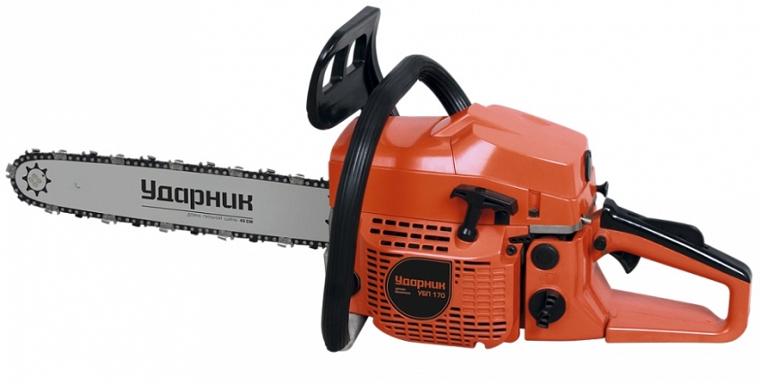 Бензопила Ударник УБП 170 предназначена для несложной работы на фермах, в садах, лесозаготовках, на строительстве и в частных хозяйствах. Корпус изготовлен из ударопрочного пластика. Увеличенный топливный бак обеспечивает продолжительную работу без дозаправки. Тормоз цепи служит для мгновенной остановки движения цепи. Инерционный тормоз обеспечивает мгновенную остановку цепи. Многоступенчатая антивибрационная система. Легкий доступ к свече и воздушному фильтру. Передняя рукоятка покрыта специальным противоскользящим материалом. На задней ручке имеется кнопка регулирования числа оборотов цепной пилы и блокиратор от случайного включения.