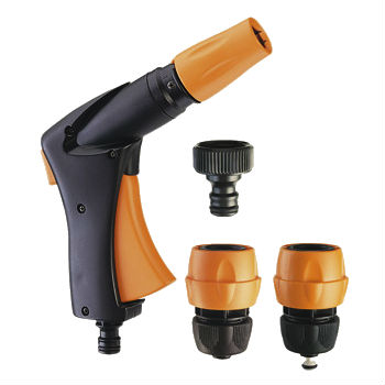 Набор для полива GF 5428 включает пистолет-разбрызгиватель для подачи сильной струи, коннектор для кранов диаметром 3/4", два переходника на шланги диаметром от 1/2" до 5/8". Переходник с открытым типом крепится к соединителю для крана. Переходник с системой "аквастоп" для автоматического подключения пистолета.