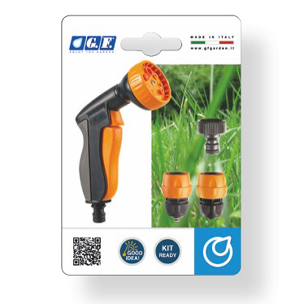 Набор для полива GF 5457 с многоструйным пистолетом-разбрызгивателем и тремя насадками: одна диаметром 3/4 для подключения к крану, две для подключения к шлангу - с системой "аквастоп" и открытая.