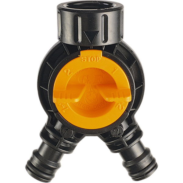Соединитель тройной с краном GF 5070 3/4". Подсоединяется к двум шлангам и поливочной установке. Есть регулятор напора воды, можно направить струи одновременно в оба шланга и полностью остановить полив.