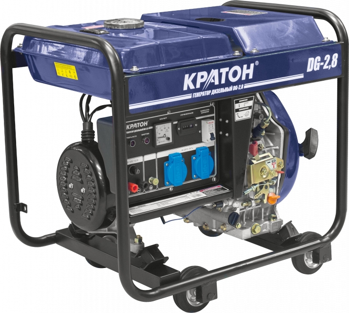 Дизельный генератор КРАТОН DG-2,8 предназначен для работы с электрооборудованием, проведения ремонтных и строительных работ, резервного питания домашнего и офисного оборудования, бытовых приборов. Ручной пусковой механизм. Декомпрессорный клапан для облегчения запуска двигателя. Система контроля и защиты от низкого уровня масла (лампа-индикатор, автоматическая остановка двигателя). Верхнее расположение топливного бака дает возможность комфортной заправки генератора. Автоматическая защита от перегрузки. Автоматический регулятор напряжения (AVR). Транспортировочные колеса позволяют перемещать агрегат без значительных трудозатрат. Две розетки 220 В; 220/16 А. Счетчик моточасов.