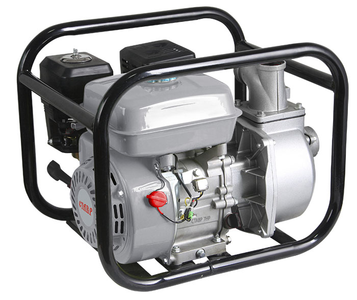 Мотопомпа бензиновая Ставр МПБ-50/5200 , центробежная, для чистой воды 5200 Вт/ 7л.с., объем 4-х тактного двигателя 208см3, число оборотов на холостом ходу 3850об/мин, диаметр входного и выходного патрубков 50мм, макс глубина всасывания 8м, макс напор 27м, макс производительность 600л/мин, объем топливного бака 3,6л, объем масляного картера 0,6л, время непрерывной работы 2часа, максимальный допустимый размер твердых частиц 5 мм предназначена для подачи больших объёмов незагрязнённой воды для различных бытовых нужд.