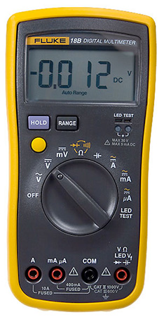Цифровой мультиметр Fluke 18B измеряет постоянные, переменные токи и напряжения, сопротивление, используется при прозвонке электрических цепей и дополнительно для тестирования диодов и измерения ёмкости. Прибор переходит в «спящий режим» в случае отсутствия измерений или отсутствии сигналов на входных гнёздах в течение 30 минут. Возможна блокировка «спящего режима». Мультиметр применяется в промышленности и полевых измерениях, в организации сервисного обслуживания мобильных телефонов и прочих средств телекоммуникации, при эксплуатации электроустановок и систем питания, в различных технологических процессах, автосервисе, разнообразных отраслях электроники. Предусмотрена возможность проверки внутренних предохранителей прибора. Сохранение необходимого показания дисплея (отсчёта измерения). Дисплей - стандартный ЖК, цифровой, 4-х разрядный с плавающей запятой, максимальное число отсчётов разрешения (интервалов дискретизации) - 4000, скорость обновления информации - 3 отсчёта/сек. Возможность автоматической и ручной установки пределов измерений. Режим «прозвонки» цепей и «тестирования» диодов может сопровождаться звуковым сигналом. Тестирование светодиодов.