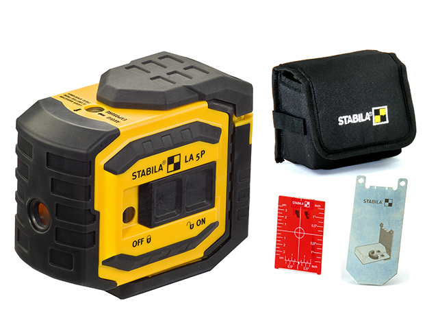 STABILA LA-5P Complete Set - пятиточечный лазерный построитель точек. Две вертикальные точки для выравнивания по отвесу вверх и вниз, три горизонтальных точки, которые воспроизводят два угла 90°. Оптимально использовать для определения и переноса прямых углов, для переноса планировки с пола на потолок, как для прямых, так и для стен с особыми формами, для быстрого и точного определения соосности. Возможно применение непосредственно на полу, крепление на штативе (резьба ¼), установка на металлических предметах или на крепежных устройствах для стен с помощью редкоземельных магнитов и V-образного паза, крепление на металлических проушинах с помощью ремня.