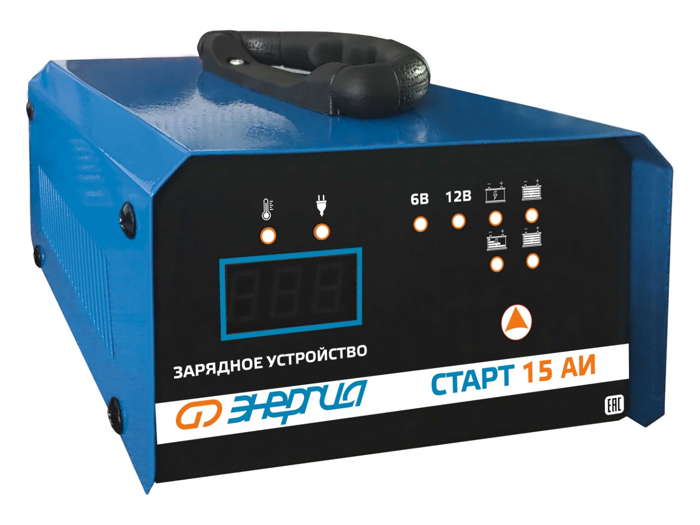 Зарядное устройство ЭНЕРГИЯ СТАРТ 15 АИ предназначено для зарядки всех типов свинцово-кислотных аккумуляторных батарей, таких как: АКБ с жидким электролитом (WET), АКБ с абсорбированным электролитом (AGM), и гелевых АКБ (GEL). Состоит из стального корпуса, в котором расположен трансформатор с электронным выпрямителем, управляющий режимами работы ЗУ. Устройство имеет панель управления, на которой расположены амперметр, переключатель силы тока, регулятор силы тока, переключатель напряжения и индикатор перегрева. В конструкцию встроены провода для подключения АКБ, на концах которых смонтированы металлические зажимы красного и черного цветов и один провод с вилкой для питания от сети 220В.
