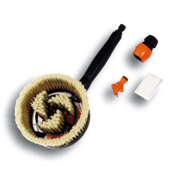 Щетка вращающаяся GF 5114 для мытья автомобилей имеет прочный корпус из поликарбоната и мягкую щетину для аккуратной очистки поверхностей. В набор также входит насадка для подачи сильной угловой струи воды, коннектор шланга и крана с автостопом и твердый шампунь.